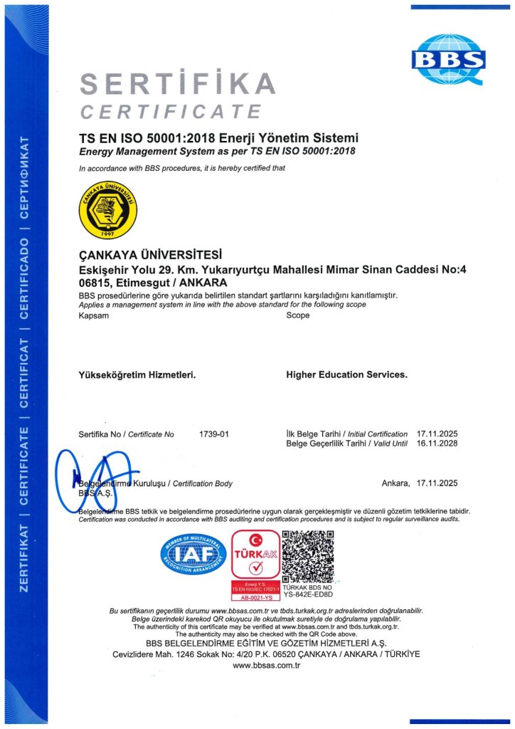 Çankaya Üniversitesi Bilgi İşlem Daire Başkanlığı, yapılan periyodik dış denetimler sonucunda ISO/IEC 27001:2022 Bilgi Güvenliği Yönetim Sistemi (BGYS) sertifikasını almıştır. Üniversitemiz daha önce ISO/IEC 27001:2013 sürümü kapsamında denetlenmiş ve uygunluk sağlamış olmakla birlikte, 2022 versiyonuna geçiş süreci başarıyla tamamlanarak güncel standarda uygunluğu tescillenmiştir.